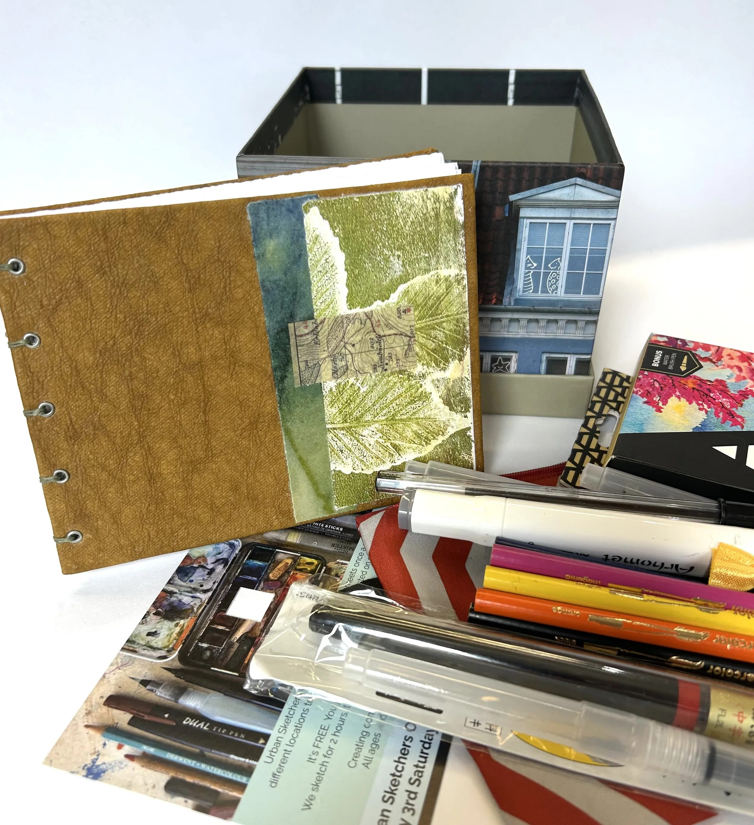 Also part of the event is an online silent auction of artworks, class offerings and other experiences by resident artists. Fellow artist Jean Mason and I put together two boxes: each is filled with sketching supplies, a sketchbook I made, and a slot in an upcoming workshop with Jean. Start a new adventure or brush up on sketching and journaling skills with your winning bid! I also have a painting included in the auction.